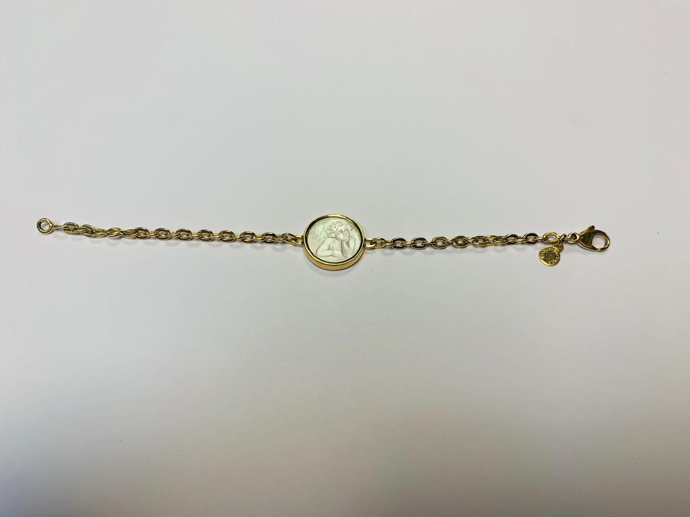 Au centre de la chaîne se trouve une médaille en nacre d'un diamètre de 14 millimètres sertie clos en Or Jaune, sur laquelle est représenté un ange.