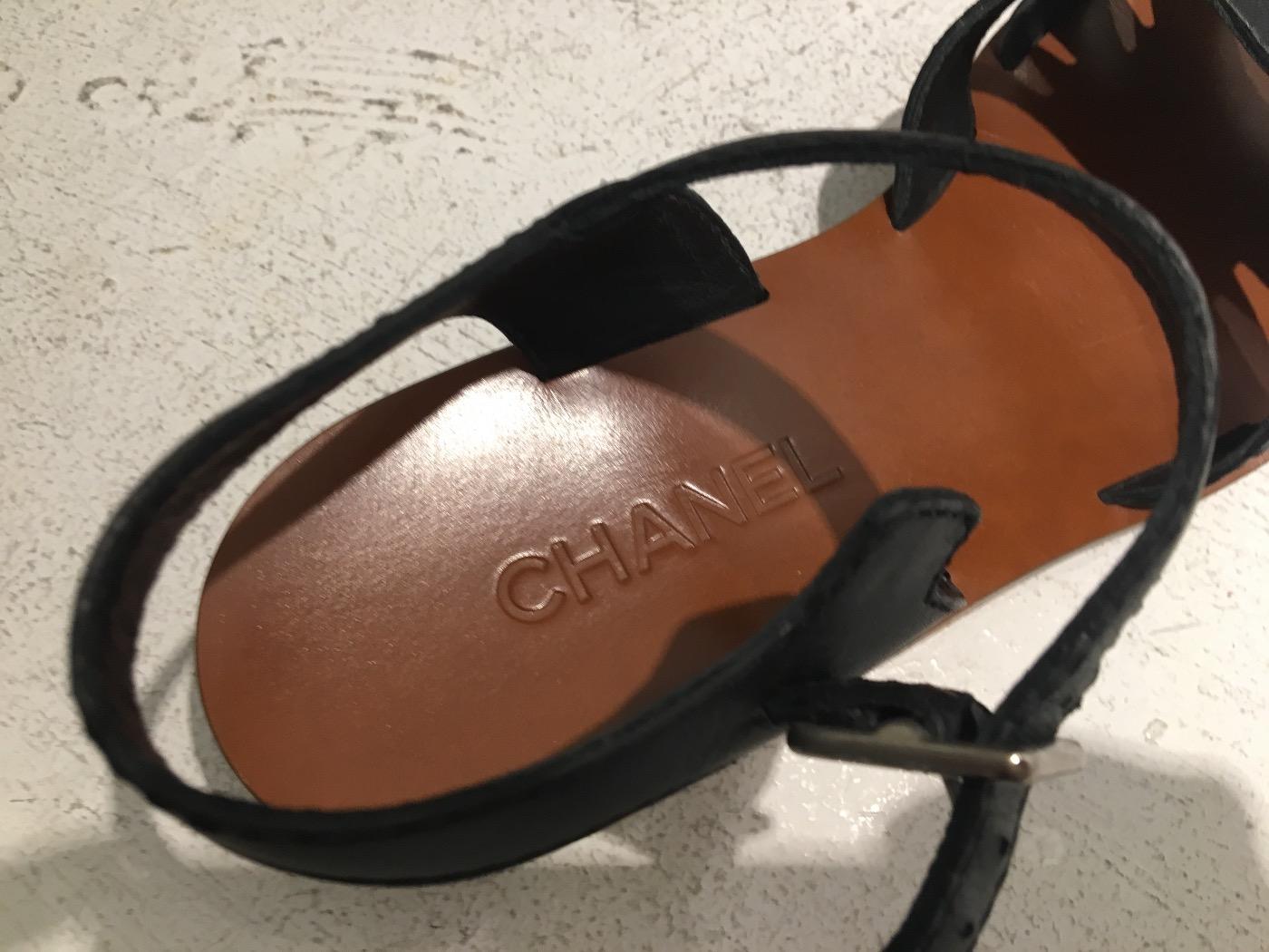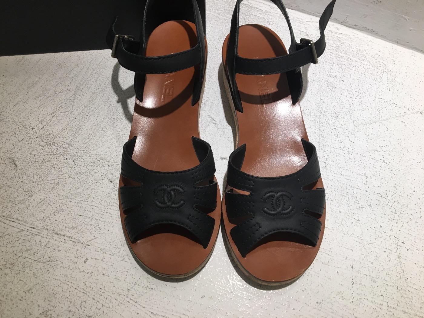 Superbes sandales CHANEL compensées en liège et cuir noir.