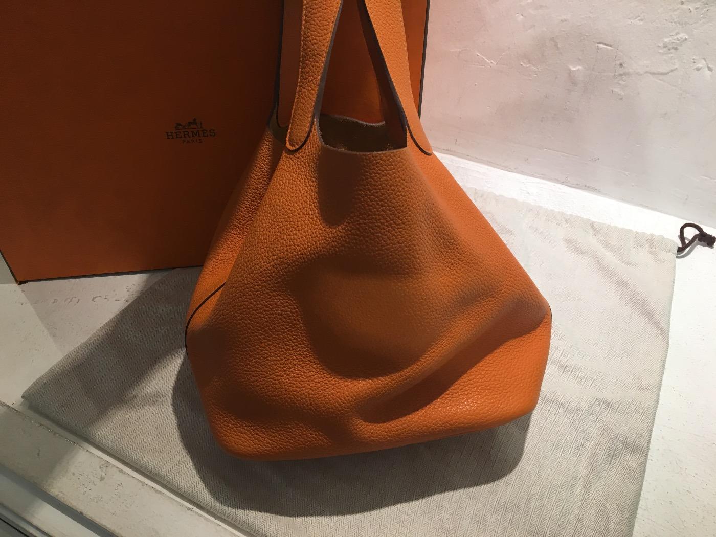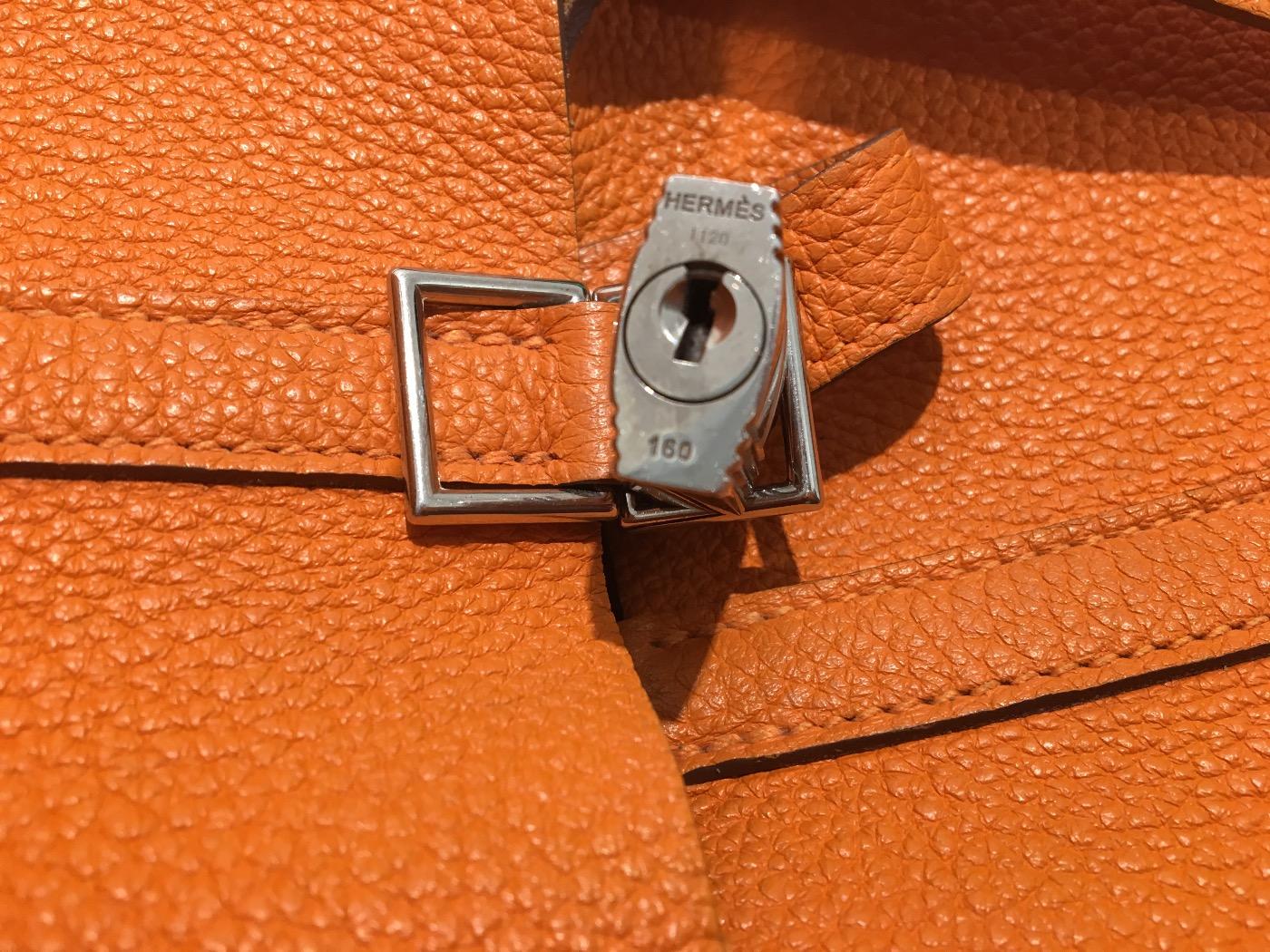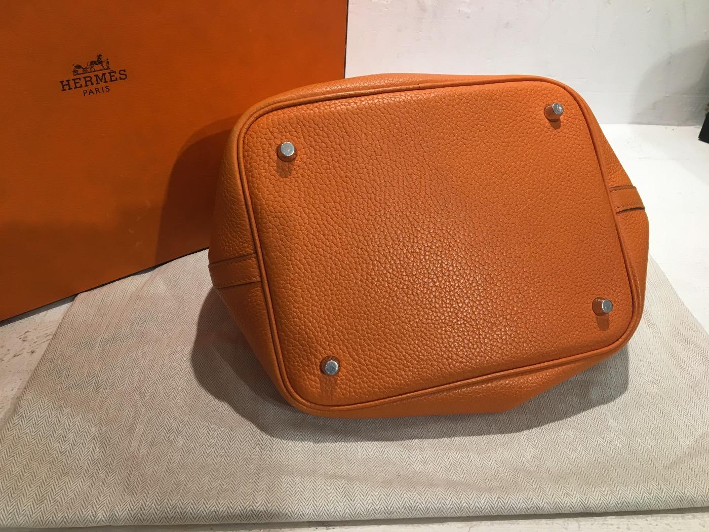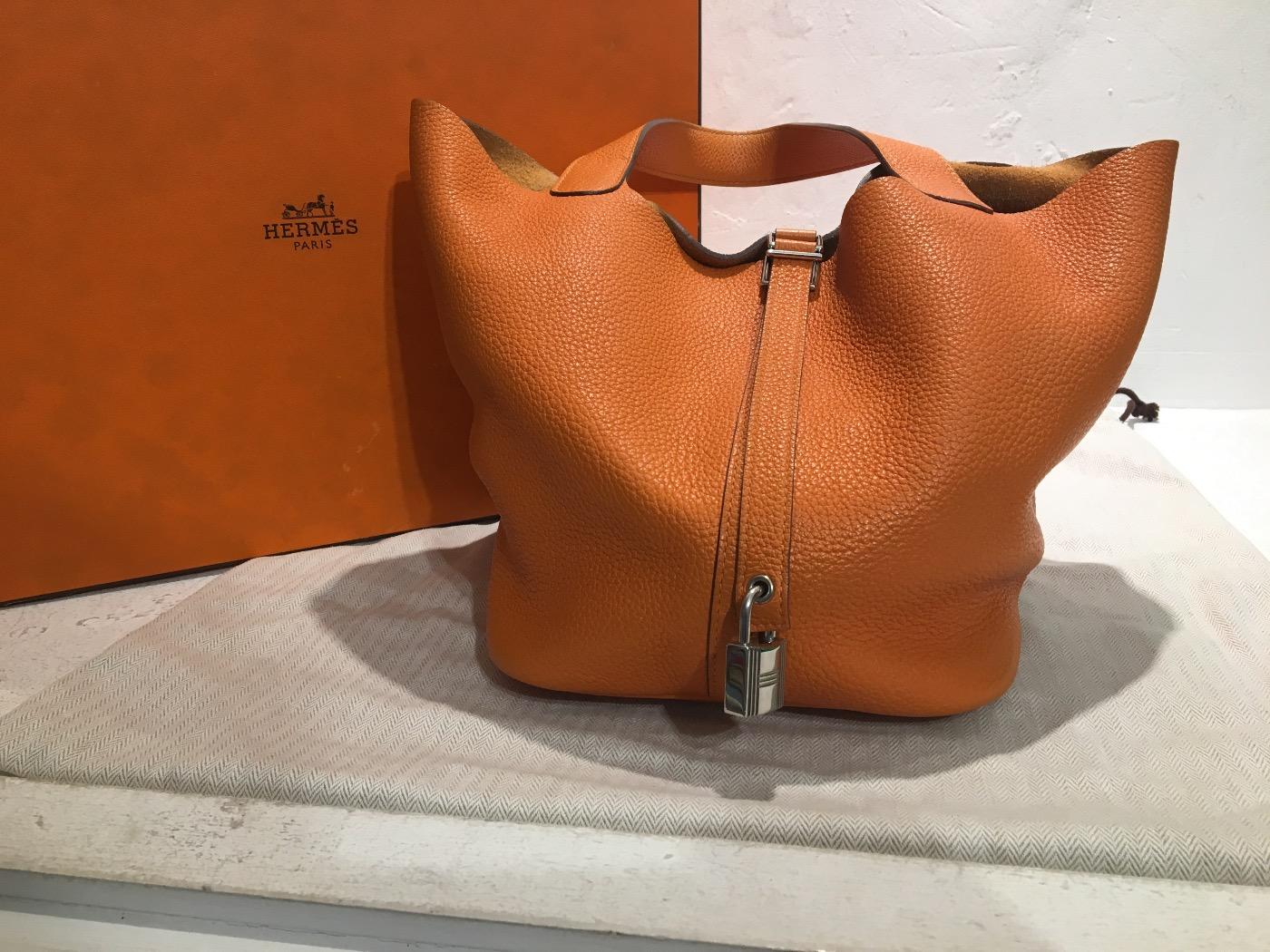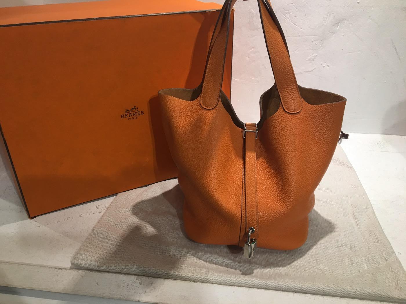 Magnifique sac HERMES modèle Picotin Lock En cuir orange et ornements argentés En excellent état Vendu avec dustbag ,boite,cadenas mais malheureusement les clefs ont été perdues Petit modèle 21,5x22x18